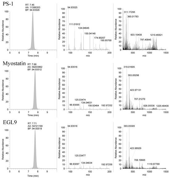 Representative extracted ion chromatograms (94.935 m/z) and MS2 spectra from 1500 m/z with 601 m/z scan window for PS-1, MYO, and EGL9 oligonucleotides.