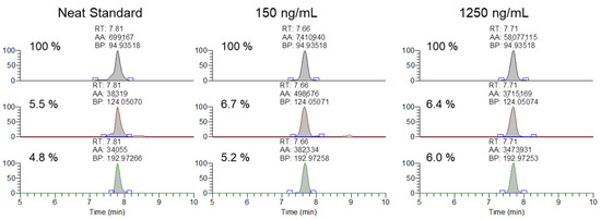After the initial validation of the methodology was conducted, the method was applied to analyze 20 previously cleared serum samples submitted by regulatory clients, with the extraction and analysis completed within a day of initiation. None of the analyzed samples contained any of the observed exogenous modifications. Finally, the ability of the methodology to meet the AORC guidelines for identification by chromatography and mass spectrometry was assessed using samples spiked with the MYO oligonucleotide at 150 and 1250 ng/mL. As shown in Figure 5, the samples fortified at the low and high QC levels were readily confirmable using the 94.935, 124.050, and 192.972 m/z product ions.