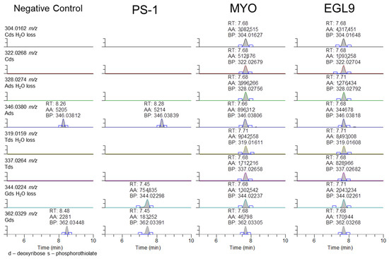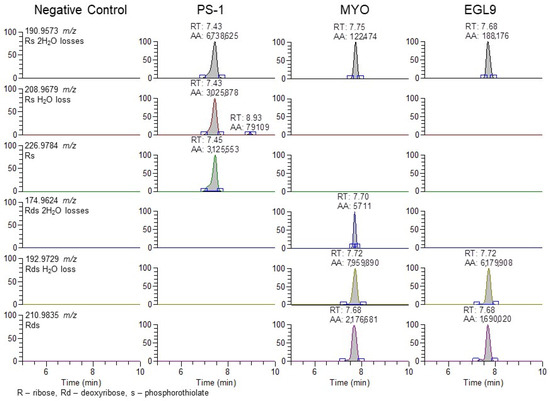 Unfortunately, the presence of a specific fragment associated with the 2′-methoxyethoxy ribose and the phosphorothioate linker could not be observed, suggesting that either the incorrect ions were evaluated or there is further fragmentation that resulted in the losses of ions corresponding to the presence of the 2′-methoxyethoxy modifications. The observation of the product ion containing the phosphorothioate modification and its associated sugar suggested that the addition of these modifications may be observable with their corresponding base. As shown in Figure 8, the phosphorothioate-modified deoxyribonucleotides were observable in the EGL9- and MYO-fortified samples. The presence of the peak at 7.4 min for PS-1 for the 344 and 362 m/z product ions is attributed to the c1 product ion of the sequence.