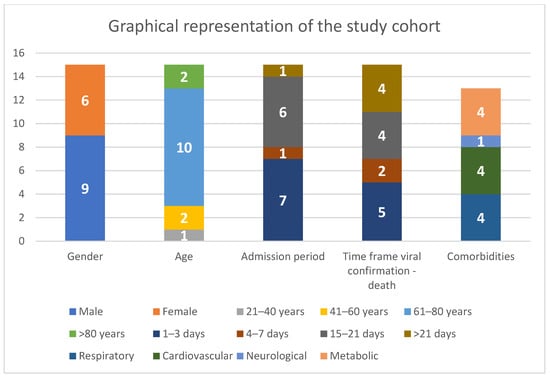 The study cohort comprised 9 males and 6 females, aged between 31 and 82 years, with a mean age of 67 years. All patients were hospitalized before their demise and were confirmed to have SARS-CoV-2 infection via nasopharyngeal swab testing. The duration of hospitalization ranged from 1 to 39 days, with two patients experiencing multiple admissions; only the final admission was considered for this study. The average hospital stay was 11 days. Among the 15 patients, 5 were confirmed with infection 1 to 3 days before death, while 2 died 4 to 7 days after confirmation. Additionally, 4 patients exhibited symptoms and tested positive between days 15 and 21 before death, and 4 patients died 21 days after polymerase chain reaction (PCR) confirmation, with the longest interval being 68 days. The average duration between infection confirmation and death was 15 days. Regarding comorbidities, four cases presented respiratory conditions, including chronic obstructive pulmonary disease (2 cases), pulmonary emphysema (1 case), or stage IV pulmonary neoplasm (1 case). Four patients had cardiovascular comorbidities, such as atherosclerotic disease and arterial hypertension, while one patient had neurological conditions like Parkinson’s and dementia. Additionally, four cases exhibited metabolic comorbidities, including type II diabetes (2 cases) and obesity (2 cases). Finally, three patients either had no chronic diseases or remained undiagnosed until death (Figure 1). Among the 15 patients who succumbed to confirmed SARS-CoV-2 infection, histopathological, immunohistochemical, and rt-qPCR analyses revealed that in 9 cases, the direct cause of death was acute respiratory distress syndrome induced by viral pneumonia, with four of them also showing chronic pulmonary lesions, characterized by pronounced pulmonary fibrosis alongside viral persistence. In three cases, tissue analysis indicated abnormalities consistent with COVID-19 viral pneumonia, with alterations suggestive of bacterial superinfection shortly before death. Bacterial blood cultures confirmed this diagnosis before death, and microscopic lung images showed classic bacterial pneumonia superimposed on alterations consistent with viral infection. The most common bacterial pathogens found were Staphylococcus aureus and Klebsiella pneumoniae. One 68-year-old female patient succumbed to spontaneous retroperitoneal hemorrhage following anticoagulation therapy, with microscopic and immunohistochemical findings indicative of viral pneumonia and pulmonary fibrosis. The youngest patient, a 31-year-old male, passed away after 68 days from confirmed nasopharyngeal swab testing and 39 days of hospitalization due to severe sepsis secondary to multiple bacterial infections of the respiratory tract and superinfected decubitus ulcers with multi-drug-resistant bacteria. The final case, a 71-year-old female, died from massive pleural effusion associated with stage IV pulmonary neoplasm, yet histopathological and immunohistochemical (IHC) analyses revealed changes consistent with SARS-CoV-2 pulmonary involvement.