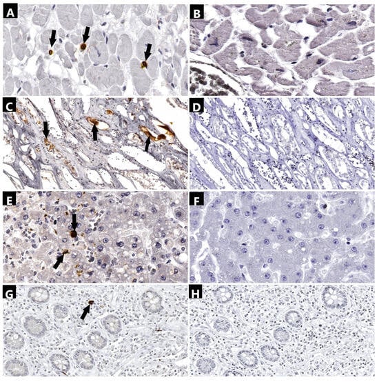 Immunohistochemical analysis of tissue samples collected (anti-SARS-CoV-2 nucleocapsid antibody): (A) myocardium (2240×)—positivity in interstitial macrophages (arrows); (B) myocardium (2240×)—negative control; (C) renal parenchyma (600×)—positivity in injured tubular cells (arrows); (D) renal parenchyma (600×)—negative control (E) liver (1730×)—positivity in hepatocytes and Kuppfer cells (arrows); (F) liver (1730×)—negative control; (G) small intestine (590×)—positivity in lamina propria macrophages (arrows); and (H) small intestine (590×)—negative control.