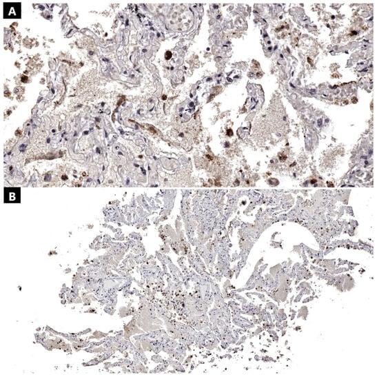 The technique for antibody incubation was automated, utilizing the Epredia Autostainer 360 (Epredia, Kalamazoo, MI, USA). Tissue specimens embedded in paraffin wax were manually sliced using a microtome to a thickness of 3–5 microns. Following this, these sections were fixed to positively charged microscopic slides to ensure secure adhesion. The slides containing the sliced tissue specimens were left to incubate for 2 h at 58 °C. Prior to epitope demasking, the slides underwent deparaffinization with xylene and rehydration using ethanol at decreasing concentrations. Epitope recovery was facilitated using the ImmunoDNA Retriever kit (BioSB, Santa Barbara, CA, USA) with a citrate buffer solution at a pH level of 6. The primary antibodies utilized were sourced from the IgG mouse monoclonal isotype. This set included the SARS-CoV-2 nucleocapsid antibody for identifying the viral nucleocapsid within the cytoplasm of infected cells. The antibody was pre-mixed, negating the need for a dilution protocol. For the chromogenic immunohistochemical reaction, we utilized an anti-mouse HRP IgG secondary antibody with the DAB chromogen. Hematoxylin served as the counterstain. The immunohistochemical preparation adhered to the same protocol as previous research conducted in our laboratory []. For the positive controls, we acquired Hydrophilic Plus slides containing SARS-CoV-2 positive lung tissues (Figure 4). To establish a negative control for the primary antibody, we utilized a nonspecific mouse monoclonal IgG isotype for all SARS-CoV-2 positive immunohistochemical sections examined (Figure 3). Additionally, for negative controls, tissue specimens obtained from three pre-pandemic patients who died from a massive cerebral hemorrhage, ischemic stroke, and aortic rupture were analyzed (Figure 5).