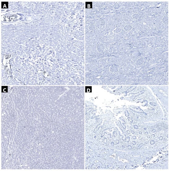 Immunohistochemical analysis of tissue samples collected (anti-SARS-CoV-2 nucleocapsid antibody): (A) myocardium (120×)—negative control; (B) kidney (110×)—negative control; (C) liver (170×)—negative control; and (D) intestine (210×)—negative control.