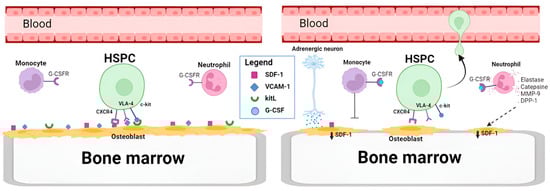 On the left side, cells have not been exposed to G-CSF; therefore, osteoblasts and endothelial cells show on their surface a high expression of cell-adhesion-related molecules, such as SDF-1, VCAM- 1, or kitL. On the right side, cells have been exposed to G-CSF, a molecule recognized by the G-CSFR receptor. This causes neutrophils to release protease enzymes that accumulate in the BM and degrade molecules related to cell adhesion. Furthermore, both the secretion of adrenaline by sympathetic neurons and the secretion of certain factors by macrophages promote a reduction in SDF-1 expression, which leads to the disjunction and mobilization of HSPC cells from the bone marrow. Created with BioRender.com.