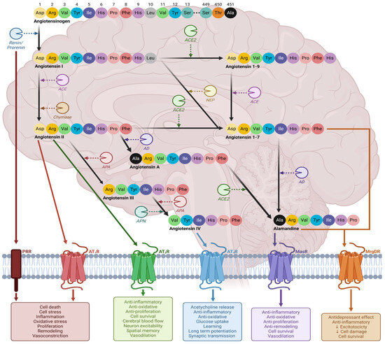 Schematic diagram of the brain RAS, depicting the various peptides, enzymes and receptors involved and the subsequent effect on specific neurological functions when activated by their ligands [44,45,46]. Angiotensinogen is first converted to AngI by renin and its precursor, prorenin. AngI can be metabolized to AngII by ACE and chymase, converted to Ang(1–9) by ACE2 or catalyzed into Ang(1–7) by neprilysin [31,45]. AngII can associate with either AT1R or AT2R, resulting in detrimental or homeostatic promoting effects, respectively [31,45]. Furthermore, AngII can then be converted to AngIII by aminopeptidase A (APA), AngA by aspartate decarboxylase (AD) or Ang(1–7) by ACE2 [31,45]. The resulting Ang III peptide is further acted upon by APA and alanyl aminopeptidase to become AngIV, which interacts with AT4R to promote neuroprotective effects [31,45]. Ang(1–9) can be catalyzed by ACE to either directly bind to the Mas-related G-coupled protein receptor (MrgDR) or can be acted upon by AD into alamandine, interacting with the Mas1 oncogene receptor (MasR) [31,45]. Finally, AngA can also be converted to alamandine by ACE2 [26]. Activation of prorenin receptor or AT1R by renin/prorenin and AngII, respectively, results in deleterious events, such as cell death, inflammation, oxidative stress, and vasoconstriction [44,45,46]. In contrast, activation of AT2R, AT4R, MasR and MrgDR induces opposing advantageous effects [44,45,46]. Abbreviations: ACE, angiotensin-converting enzyme; AD, aspartate decarboxylase; Ala, alanine; AngI, angiotensin; AngII, angiotensin II; AngIII, angiotensin III; AngIV, angiotensin IV; APA, aminopeptidase A; APN, alanyl aminopeptidase; Arg, arginine; Asp, aspartic acid; AT1R, angiotensin II type 1 receptor; AT2R, angiotensin II type 2 receptor; AT4R, angiotensin II type 4 receptor; His, histidine; Ile, isoleucine; Leu, leucine; MasR, Mas1 oncogene receptor; MrgDR, Mas-related G-coupled protein receptor; NEP, neprilysin; Phe, phenylalanine; Pro, proline; Ser, serine; PRR, prorenin receptor; RAS, renin–angiotensin system; Thr, threonine; Tyr, tyrosine; Val, valine. Figure made using Biorender.com (access date: 10 March 2024).