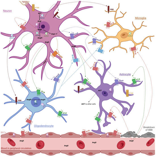 The renin–angiotensin system (RAS) is a critical regulator of blood pressure by controlling blood volume, fluid and electrolyte balance and systemic vascular resistance through coordinated crosstalk between the heart, vasculature, and kidneys [26,27,28]. The RAS promotes hemodynamic and cardiovascular homeostasis through two opposing systems: the traditional and counterregulatory axes [29]. Importantly, the discovery of an independent RAS expressed locally in the cells of the nervous system (Figure 1 and Figure 2) has been shown to be involved in learning and memory consolidation, intellect and cognition, vasopressin secretion, appetite, and thirst [30,31] and may have an unknown role in maintaining BBB integrity [32,33]. Overactivation of the traditional axis (angiotensin-converting enzyme (ACE), angiotensin II (AngII) and angiotensin II type 1 receptor (AT1R)), leads to RAS dysfunction, triggering oxidative stress, neuroinflammation, deleterious remodeling and apoptosis. This is associated with neurodegenerative diseases like Alzheimer’s, Huntington’s, multiple sclerosis [34], Parkinson’s [35], cerebrovascular disease [36], cognitive impairment [37] and encephalopathy [38]. Correlations between brain RAS dysfunction, substance abuse and addiction, and drug seeking behavior have recently been reported in animals and humans [39]. Psychoactive substances disrupt brain RAS homeostasis by altering the expression of components involved in the traditional and counterregulatory axes. For example, nicotine upregulates AT1R and downregulates AT2R and ACE2 expression in neurons and glial cells [40,41], cocaine increases the expression and activity of ACE [42], amphetamine augments AT1R and AngII expression [43] and excessive alcohol consumption decreases mRNA levels of ACE2, angiotensin 1–7 (Ang(1–7)) and elevates ACE1 activity, Ang II expression and AT1R mRNA [39]. Thus, restoring the underlying brain RAS balance may be key to the treatment of substance abuse and addiction.