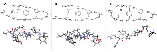 The conformation of small peptides is largely driven by strong electrostatic interactions, especially ion pairing (salt bridge formation), which greatly influence conformational outcomes. In AngII, Asp carboxylate and Arg guanidinium side chain groups, together with the N- and C- terminals, are major energy determinants. Chemical reactivity studies on AngII suggest activation of the Tyr hydroxyl group, indicating interaction with the C-terminal carboxylate [77]. Additionally, His imidazole of AngII is activated, indicating interaction with the C-terminal carboxylate and TyrOH, possibly forming a CRS that links the TyrOH–His imidazole–carboxylate (of Phe). The CRS formation will be energetically favored because of the increased charge delocalization available if there is no extra strain produced in other parts of the molecule. Evidence from fluorescence lifetime spectroscopic studies [78] supports this mechanism. As a corollary of this, it is likely that the Arg guanidino cation would naturally move in to stabilize the Tyr anion formed by the CRS, acting as a chaperone. The loss of bioactivity (> 90%) associated with the substitution of Arg (e.g., with norleucine) supports the idea of an important role for the guanidino group. Activity is also greatly depreciated when the N-terminal amino cation is neutralized (e.g., by acetylation) or the Asp carboxylate anion is removed (e.g., by substitution with alanine (Ala), as in AngA. This suggests a complex interactive role for all three charged groups, possibly working in concert (Figure 3A–C). According to Figure 3A, in addition to the tripartite interaction in the C-terminal half of the AngII molecule, there is also a tripartite interaction in the N-terminal region invoking amino–carboxyl–guanidino, which presumably helps to position the guanidino to interact with TyrO-. The Asp carboxylate anion will naturally attempt to position itself to interact with both amino and guanidino cations. In Figure 3B, the removal of the Asp carboxylate disrupts this tripartite interaction such that the Arg guanidino is no longer close enough to stabilize TyrO- and there is a consequent loss of bioactivity (< 5%). Substituting Sar1 restores activity, implying that repulsion between amino and guanidino groups is compensated for by a turn in the backbone induced by Sar. This repositions the Arg sidechain group to chaperone TyrO- (Figure 3C) (considering the limitations imposed by this two-dimensional representation).