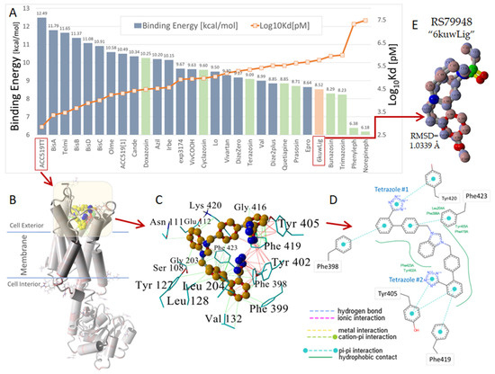 (A) Docking results obtained for 29 selected ligands, including various sartans (blue bars) and known inverse agonists to an alpha-2C-adrenergic receptor (green and orange bars), belonging to the GPCR class. Ligand docking was performed against the energy-minimized (AMBER14) alpha-2c-adrenergic receptor, PDB 6KUW, using AutoDock VINA with 900 runs per ligand with assigned AMBER14 atomic point charges and dihedral barriers [28]. Of the 29 ligands evaluated, the anionic bisartan ACC519TT exhibited the strongest docking energy (12.5 kcal/mol). ACC519TT outperformed the opioid-like ligand “6kuwLig” (compound RS79948:(8~(a)~(R),12~(a)~(S),13~(a)~(R))-12-orange bars) (accessed on 11 March, 2024) designed as a specific inhibitor of the 6KUW receptor. (B) Structure of the 6KUW opioid receptor with docked bisartan ACC519TT (yellow carbon atoms) embedded in the cell surface domain. The yellow shaded area approximates the docking region of interest. Residues shown in ethylsulfonyl-3-methoxy-5,6,8,8~(a),9,10,11,12~(a),13,13~(a)-decahydroisoquinolino [2,1-g][1,6]naphthyridine; https://www.rcsb.org/structure/6KUW; “stick” rendering indicate the locations of arginine residues for 6KUW. (C) Illustrates the 3D rendition of the docked ligand ACC519TT, while (D) presents the 2D interaction diagram calculated using PoseView-2D, ZBH-Center for Bioinformatics: https://proteins.plus/) (accessed on 11 March 2024). Principle binding interactions included non-covalent pi–pi resonances (red lines in (C) and cyan dashed lines in (D)) of both anionic tetrazole groups with proximal tyrosine residues (Tyr402 and Tyr405) and phenylalanine (Phe398). Hydrophobic interactions (green lines) were also heavily represented in ACC519TT binding. (E) Superposition of the PDB 6KUW X-ray crystallographic structure of the co-crystallized “6kuwLig” ligand (blue carbon atoms, as spheres) against docked ligand “6kuwLig” (maroon colored carbon atoms, as spheres). The superimposed molecules exhibited an RMSD of 1.0339 Angstroms, indicating that VINA algorithms were able to reproduce a high-quality experimental pose for this ligand. Abbreviations: ACC519TT, benzimidazole-N-biphenyl tetrazole; ACC519[1], benzimidazole-N-biphenyl tetrazole; Asn, asparagine; Azil, azilsartan; BisA, 4-Butyl-N,N0-bis([[20-(2H-tetrazol-5-yl)]biphenyl-4-yl]) methylimidazolium bromide; BisB, 4-Butyl-2-hydroxymethyl-N,N0-bis([20-(2H-tetrazol-5-yl)- biphenyl-4-yl])methyimidazolium bromide; BisC, 2-Butyl-4-chloro-5-hydroxymethyl-N,N0-bis([20-(2H-tetrazol- 5-yl)biphenyl-4-yl]methyl)imidazolium bromide; BisD, 2-Butyl-N,N0-bis([20-(2H-tetrazol-5-yl)biphenyl-4-yl]methyl) imidazolium bromide; Cande, candesartan; Dize, diminazene aceturate; Epro, eprosartan; exp3174, losartan carboxylic acid; Glu, glutamic acid; Gly, glycine; GPCRs, G-protein coupled receptors; Ireb, irbesartan; Kd, dissociation constants; Leu, leucine; Lo, losartan; norepineph, norepinephrine; PDB, Protein Data Bank; Phe, phenylalanine; phenyleph, phenylephrine; RMSD, root mean standard deviation; Ser, serine; Telmi, telmisartan; Tyr, tyrosine; Val, valsartan (7A) or valine (7C); Å, angstrom.