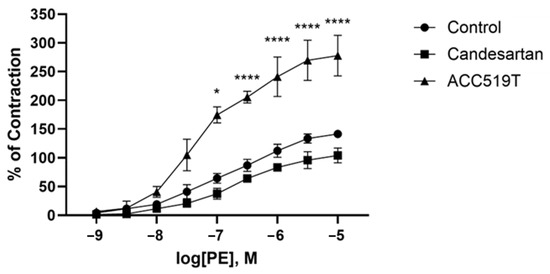 Effects of ACC519T and candesartan on phenylephrine-induced contraction of rabbit iliac arteries. Pretreatment with ACC519T significantly augmented contraction responses to phenylephrine (mean ± standard error of the mean (SEM)) (* p < 0.05, **** p < 0.0001); however, no differences in contraction abilities were observed in rings treated with candesartan (mean ± SEM). Abbreviations: ACC519, benzimidazole-N-biphenyl tetrazole; PE, phenylephrine.