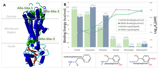 (A) 6KUW A chain showing predicted allosteric pockets (green shaded areas). Allosteric sites were calculated using Passer: Protein Allosteric Sites Server (https://passer.smu.edu/; access date: 5 March 2024). Docking was performed against allosteric site 1 for both 6KUW and 7B6W. (B) Binding energies of different drugs competed for the same site on the alpha receptors. Abbreviations: Allo, allosteric; Cande, candesartan; H, hydrogen; Kd, dissociation constants; Metamphet, methamphetamine; N, nitrogen; Norepi, norepinephrine; O, oxygen; Phenyleph, phenylephrine.