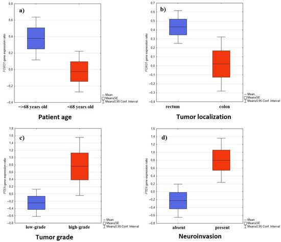 Firstly, the patients were divided into two groups with regard to tumor location: those with tumors located in the colon and those with tumors located in the rectum. No significant differences in expression were found between the locations, apart from the FOXO1 gene, which was more strongly expressed in the rectum than the colon (p = 0.0223) (Figure 1).
