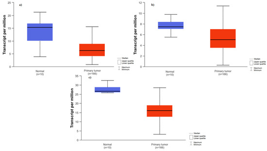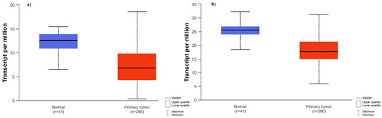 - Chandrashekar, D.S.; Bashel, B.; Balasubramanya, S.A.H.; Creighton, C.J.; Ponce-Rodriguez, I.; Chakravarthi, B.V.S.K.; Varambally, S. UALCAN: A Portal for Facilitating Tumor Subgroup Gene Expression and Survival Analyses. Neoplasia 2017, 19, 649–658. [Google Scholar] [CrossRef] [PubMed]