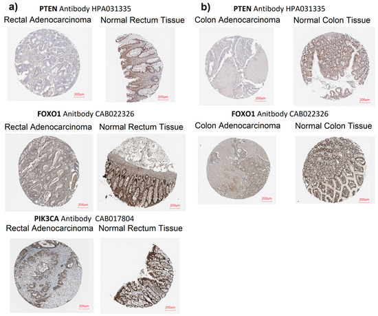 Comparison of protein expression level between tumor tissue and normal tissue; (a) PTEN, FOXO1, and PIK3CA protein expression in rectal adenocarcinoma and normal rectal tissue (Human Protein Atlas); (b) PTEN and FOXO1 protein expression in colon adenocarcinoma and normal colon tissue (Human Protein Atlas).
