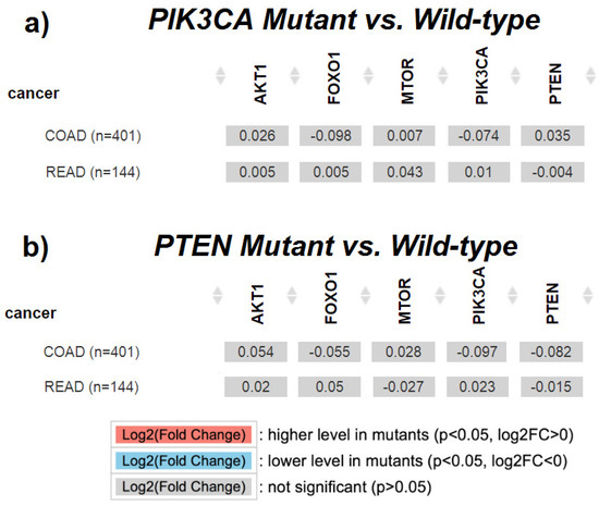 For the analysis conducted using the TIMER 2.0 platform, the data from 401 colon adenocarcinoma (COAD) samples and 144 rectal adenocarcinoma (READ) samples were utilized. Mutations in the PIK3CA gene were present in 31.5% of COAD samples and 17.7% of READ samples. Mutations in the PTEN gene were much less frequent (5.9% in COAD and 5.3% in READ). The conducted statistical analysis did not show significant differences in the expression of PIK3CA, PTEN, AKT1, FOXO1, and mTOR (FRAP) genes with regard to the presence or absence of PIK3CA and PTEN gene mutations. The detailed results are presented in Figure 5.