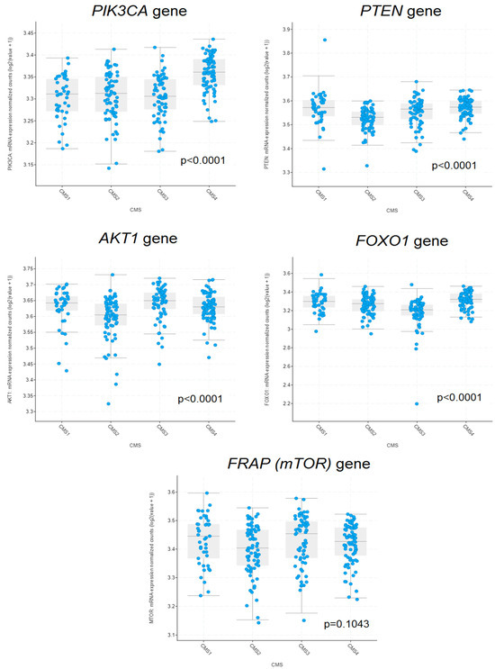 Data from 267 CRC patients were used for the analysis. Within this group, 43 samples were classified as the MSI Immune subtype (CMS 1), 76 as the Canonical subtype (CMS 2), 66 as the Metabolic subtype (CMS 3), and 82 as the Mesenchymal subtype (CMS 4). A statistically significant relationship was demonstrated between CMS and the expression levels of the PIK3CA gene (p < 0.0001), PTEN (p < 0.0001), AKT1 (p < 0.0001), and FOXO1 (p < 0.0001). The expression level of the FRAP (mTOR) gene did not significantly differ depending on CMS (p = 0.1043) (Figure 6). The highest average expression values of the PIK3CA gene were observed in CMS 4. In the same subtype, the highest average values of the FOXO1 gene were noted. Both PTEN and AKT1 exhibited the lowest expression in the CMS 2 subtype (Figure 6).