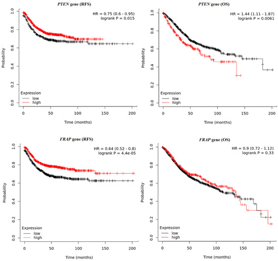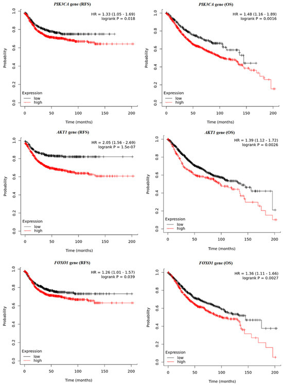 Briefly, the survival times of the colon cancer patients were compared with their gene expression pattern based on data obtained from the Kaplan–Meier plotter database. Significantly longer relapse-free survival (RFS) was observed among patients with higher PTEN (p = 0.0154) and FRAP expression (p < 0.0001). The detailed results are presented in Figure 7. The reverse results were observed for PIK3CA and AKT1; significantly longer RFS were noted for patients with lower PIK3CA (p = 0.0182) and AKT1 (p < 0.0001). In the case of RFS analysis for the FOXO1 gene, the obtained p-value (0.0391) was not statistically significant after performing multiple testing corrections (Figure 8). Overall survival (OS) analysis showed similar relationships for PIK3CA (p = 0.0016), AKT1 (p = 0.0026), and FOXO1 (p = 0.0027), where longer survival times were observed in the group of patients with higher expression of these genes (Figure 8). OS was not correlated with FRAP gene expression (p = 0.3326). However, for the PTEN gene, the analyses showed longer (OS) times for the group of patients with lower PTEN gene expression (p = 0.0061) (Figure 7).
