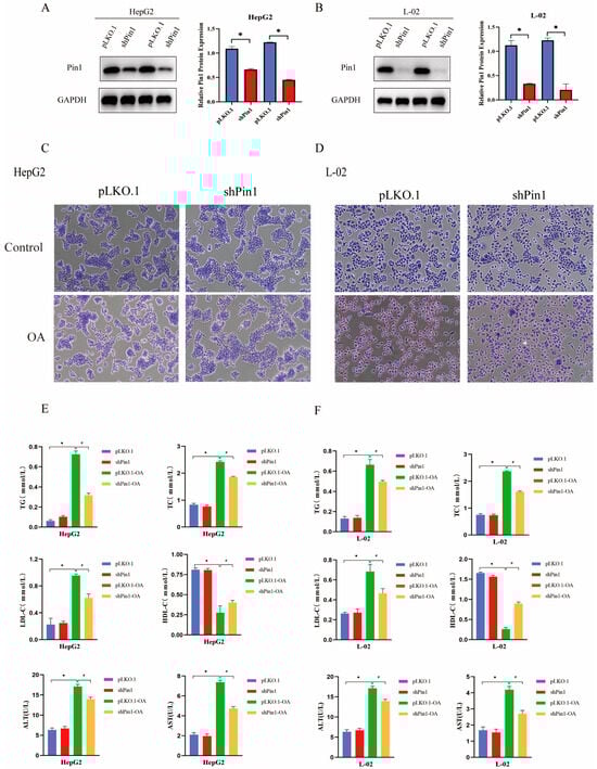 Knockdown of Pin1 inhibited lipid accumulation in an in vitro NAFLD model. (A) Western blot to verify the knockdown effect of Pin1 in HepG2 cells. (B) Western blot to verify the knockdown effect of Pin1 in L-02 cells (* p < 0.05). (C) Oil Red O staining in OA-induced HepG2 cells after Pin1 knockdown (100×). (D) Oil red O staining of OA-induced L-02 cells after Pin1 knockdown (100×). (E) Biochemical detection of changes in four levels of lipids and two indicators of liver injury in HepG2 cells after Pin1 knockdown. (F) Biochemical detection of changes in four levels of lipids and two indicators of liver function in L-02 cells after Pin1 knockdown (* indicates p < 0.05 compared with the pLKO.1 group; # indicates p < 0.05 compared with the pLKO.1-OA group, p < 0.05).