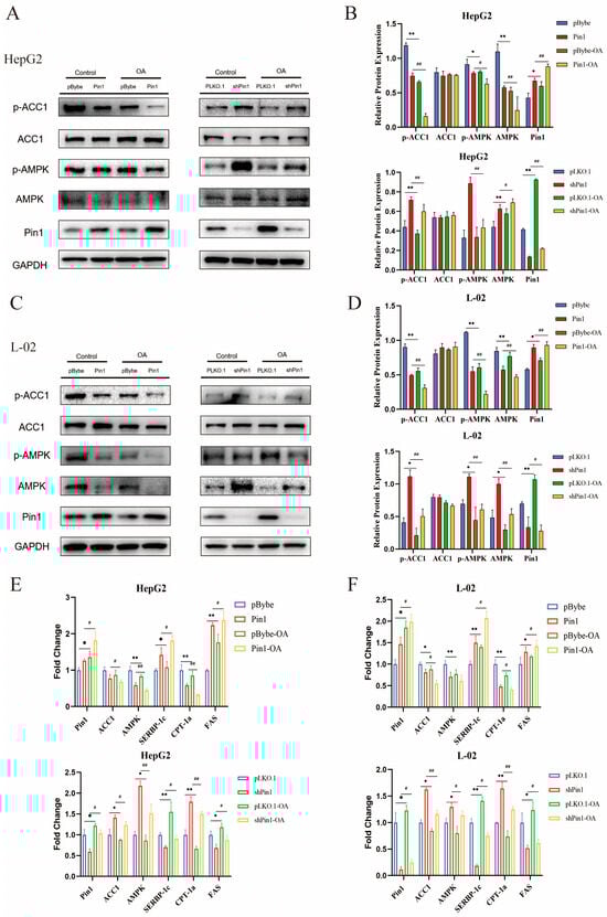 Pin1 inhibits the AMPK/ACC1 pathway in hepatocytes under metabolic stimulation. (A–D) Inhibition and activation of AMPK/ACC1 signalling pathway protein expression in HepG2 and L-02 cells after overexpression and knockdown of Pin1, respectively (* indicates p < 0.05, ** indicates p < 0.01; # indicates p < 0.05, ## indicates p < 0.01). (E,F) mRNA levels of genes involved in the AMPK/ACC1 pathway in HepG2 and L-02 cells in OA-induced cell models after overexpression and knockdown of Pin1 (* indicates p < 0.05, ** indicates p < 0.01; # indicates p < 0.05, ## indicates p < 0.01).
