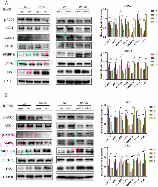 Pin1 inhibits the AMPK/ACC1 pathway in hepatocytes under metabolic stimulation. (A,B) Overexpression and knockdown of Pin1 in HepG2 and L-02 cells after the addition of the AMPK pathway inhibitor Compound C to validate AMPK/ACC1 signalling pathway protein expression and quantitative statistical plots, respectively. (* indicates p < 0.05, ** indicates p < 0.01; ## indicates p < 0.01). Note: In the statistical graph of overexpressed cells, A indicates the pBybe-OA group, B indicates the Pin1-OA group, C indicates the pBybe-OA + CC group, and D indicates the Pin1-OA + CC group. In the statistical graph of knockdown cells, A indicates the pLKO.1-OA group, B indicates the shPin1-OA group, C indicates the pLKO.1-OA + CC group, and D indicates the shPin1-OA + CC group.