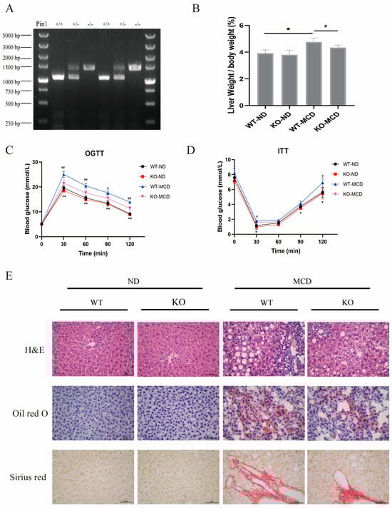 Pin1 deficiency alleviates MCD diet-induced NAFLD progression. (A) Identification of mouse genotypes. Pin1 wild-type (Pin1 +/+) mice had a band at 1000 bp, Pin1 heterozygous (Pin1 +/−) mice had two bands at 1000 bp and 1400 bp, and Pin1 knockout (Pin1 −/−) mice had a band at 1400 bp. (B) Pin1 knockout reduces the MCD diet-induced increase in liver index (* p < 0.05, #p < 0.05). (C) Knockout of Pin1 improves glucose tolerance in mice after MCD diet feeding (** indicates p < 0.01 compared with the WT-ND group; # indicates p < 0.05 compared with the WT-MCD group; ## indicates p < 0.01 compared with the WT-MCD group). (D) Knockout of Pin1 improves insulin sensitivity in mice after MCD diet feeding (* indicates compared with the WT-ND group; p < 0.05; # indicates p < 0.05 compared with the WT-MCD group). (E) Upper layer: HE staining to observe the effect of Pin1 knockout on histopathological changes in mouse liver tissues (400×); middle layer: Oil Red O staining to observe the effect of Pin1 knockout on lipid accumulation in mouse liver tissues (400×); lower layer: Sirius Scarlet staining to observe the effect of Pin1 knockout on the degree of fibrosis in mouse liver tissues (400×).