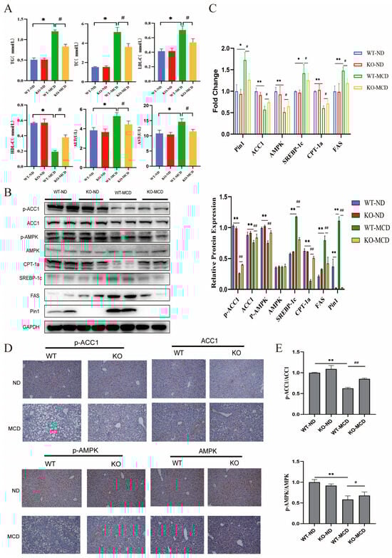 Pin1 deficiency alleviates MCD diet-induced NAFLD progression. (A) Knockout of Pin1 improved MCD-induced lipid levels and liver function impairment in mouse serum (* p < 0.05, #p < 0.05). (B) Western blot detection and quantification of AMPK/ACC1 pathway protein expression in liver tissues of mice induced by MCD diet. (C) RT-qPCR was used to detect mRNA levels of related genes in AMPK/ACC1 pathway in liver tissue of mice induced by MCD diet (* indicates compared with WT-ND group, p < 0.05; ** indicates p < 0.01 compared with WT-ND group; # indicates p < 0.05 compared with WT-MCD group; ## indicates p < 0.01 compared with WT-MCD group). (D) Immunohistochemical detection of p-ACC1, ACC1 and p-AMPK, AMPK protein expression levels in mouse liver tissues (200×). (E) Immunohistochemical protein expression quantification plots (** indicates p < 0.01 compared with the WT-ND group; # indicates p < 0.05 compared with the WT-MCD group; ## indicates p < 0.01 compared with the WT-MCD group).
