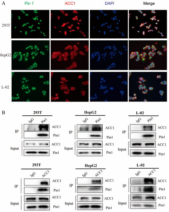 Pin1 interacts with ACC1 and blocks ACC1 phosphorylation. (A) Immunofluorescence assay results show the colocalization of Pin1 with ACC1 in cells (200×). (B) Co-IP detection of the interaction between Pin1 and ACC1 in cells.
