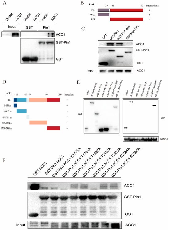 Pin1 interacts with ACC1 and blocks ACC1 phosphorylation. (A) GST pull-down assay detected the direct interaction between Pin1 and ACC1. (B) Schematic representation of the Pin1 WW and PPI structural domains. (C) GST-pull down detection of full-length ACC1 and Pin1 and Pin1 WW and PPI structural domain interactions. (D) Schematic representation of the 5 truncated bodies of ACC1. (E) GST pull-down detection of Pin1 and ACC1 full-length and 5 truncated body interactions. (F) The 1705-2380 domain containing T1791A and T2229A mutant ACC1 cannot bind to GST-Pin1 at all.