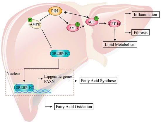 To further clarify the role of Pin1 in NAFLD, we constructed an NAFLD model in Pin1 knockout mice and confirmed that knockdown of Pin1 reduced liver steatosis and fibrosis, while immunohistochemical results showed that knockdown of Pin1 could activate the AMPK/ACC1 signalling pathway and regulate the changes in its downstream target genes, reducing the lipid accumulation in the liver caused by NAFLD.