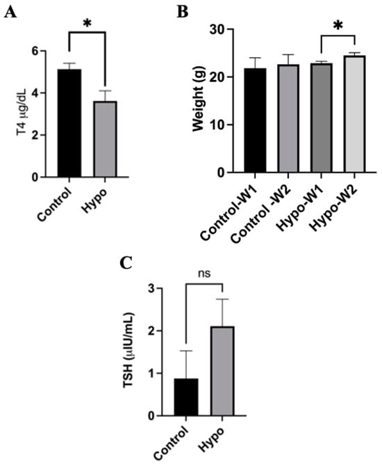 Induction of hypothyroidism in C57BL/6 adult mice. C57BL/6 mice were subjected to a methimazole treatment to induce a decrease in T4 levels. As observed in (A), T4 levels were significantly reduced in the methimazole-treated mice (Hypo). (B) Increased weight was observed in the Hypo group during the second week of treatment (Hypo-W2); this observation is consistent with what has been observed in hypothyroid patients. Thyroid-stimulating hormone (TSH) levels were also evaluated. (C) An increase in plasmatic levels is observed, consistent with a hypothyroid phenotype, but no significant differences were observed. Statistics were carried out by Student’s t-test or one-way ANOVA test and Tukey’s post-test; ns: non-significant * p > 0.05; N = 3 mice per group.