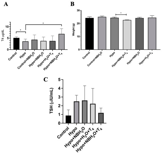Eight-week-old C57BL/6 mice were treated with a 0.02% (w/v) of methimazole (MMI, Sigma, M8506, Milwaukee, WI, USA) in the drinking water for two weeks to induce a decrease in T4 levels. The MMI-treated group was named Hypo. At the same time, a control group was established and defined as mice that only drank normal water during the treatment. After the two weeks of treatment, a blood sample from the facial vein was obtained and T4 and TSH plasmatic levels were determined by Enzyme Immunosorbent Assay (ELISA). The mice’s weight was also registered before and after the 2 weeks of treatment. After MMI treatment, Hypo mice were separated into 3 experimental groups. Hypo treated with normal water (Hypo+H2O), Hypo treated with CO2-NB-supplemented water (Hypo+CO2-NBs), and Hypo treated with CO2 nanobubbles and T4 (25 µg/Kg mice weight) supplemented water (Hypo+NBH2O+T4). Control mice were separated into two groups, one treated with normal water (Control+H2O) and the second group treated with CO2-NB-supplemented water (Control+CO2-NBs). After five days of treatment, weight was registered, a blood sample was obtained from the facial vein and T4 and TSH levels were determined. All animal procedures were approved by the Ethics committee of the life science faculty at Universidad Andrés Bello.