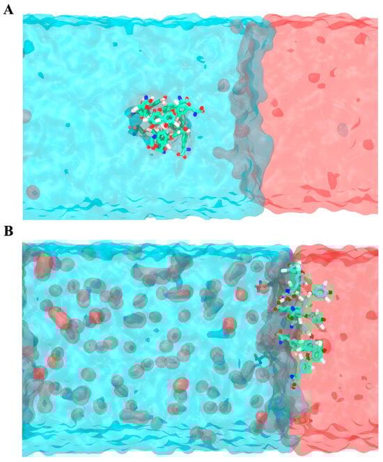 To evaluate the energy interactions of T4 with its microenvironment, the interaction energy () was calculated using the heat of formation () provided by MOPAC at a semi-empirical PM7 level of theory. A clustering analysis was performed, where the most frequent configuration appearing in the molecular simulation was taken for all the complexes, and the results are shown in Figure 4. It can be observed that the T4zw molecule presents a larger (more negative ) interaction energy in the three different phases (water, water/gas, and gas), representing a very marked affinity with the water/CO2 interface, with a value of −77.9 kcal/mol (Figure 4A). In contrast, the interaction energy of the canonical T4 molecule is significantly higher in the three phases, assuming a value of −62.6 kcal/mol at the interface (Figure 4B). These results imply that T4zw, i.e., T4 in zwitterionic form, tends to locate at the water/CO2 interface, contributing to stabilizing the nanobubbles.