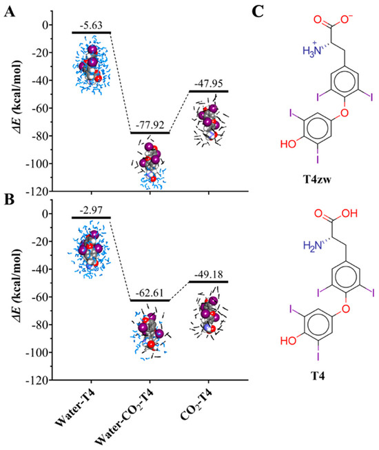 Interaction energy plot. (A) T4zw and (B) T4 molecules interacting in different phases. CO2 in black liquorice representation and water in light blue liquorice representation. (C) Chemical structure depiction. Zwitterionic T4 and canonical T4 molecules, highlighted to the Cα.
