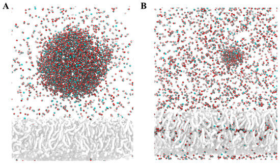 Diffusion of a CO2 nanobubble with cell membrane. (A) CO2 nanobubble placed above the cell membrane at the beginning of the simulation, depicted in red for oxygen atoms and cyan for carbons. Membrane is depicted in grey. (B) Snapshot of the last frame of the simulation, showing that CO2 molecules from the nanobubbles tend to diffuse towards the center of the membrane.