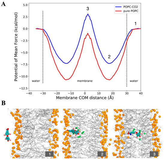 (A) Potential of Mean Force of the translocation of a T4 (zwitterionic) molecule through pure POPC and POPC-CO2 membranes. (B) Snapshots of the conformations of the T4 molecule in different stages of the reaction coordinate: (1) the molecule starts in the water (membrane COM distance = 30 Å), (2) the molecule falls into an energy well in the water–lipid interface (membrane COM distance ~15 Å), (3) T4 is in the middle of the membrane facing a high free energy barrier (membrane COM distance = 0 Å), and T4 falls again into an energy well (membrane COM distance ~−15 Å). Lipid heads appear depicted in orange, in cyan the T4 molecule and in green some CO2 molecules around T4.