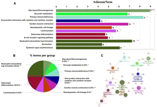 - Bindea, G.; Mlecnik, B.; Hackl, H.; Charoentong, P.; Tosolini, M.; Kirilovsky, A.; Fridman, W.H.; Pagès, F.; Trajanoski, Z.; Galon, J. ClueGO: A Cytoscape plug-in to decipher functionally grouped gene ontology and pathway annotation networks. Bioinformatics 2009, 25, 1091–1093. [Google Scholar] [CrossRef]