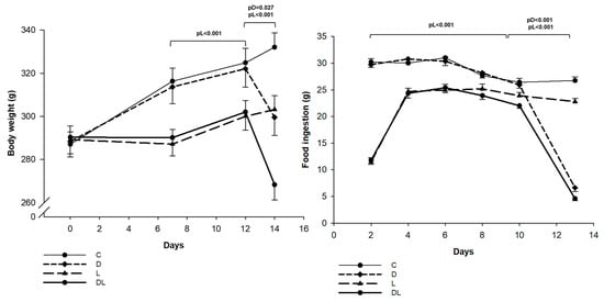 2.1. Body Weight, Food Ingestion, and Morphological Characteristics