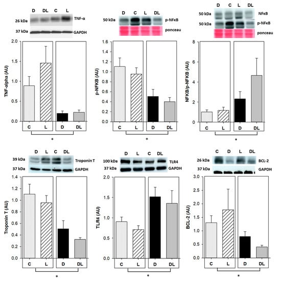 - Riad, A.; Bien, S.; Gratz, M.; Escher, F.; Heimesaat, M.M.; Bereswill, S.; Krieg, T.; Felix, S.B.; Schultheiss, H.P.; Kroemer, H.K.; et al. Toll-like receptor-4 deficiency attenuates dox-orubicin-induced cardiomyopathy in mice. Eur. J. Heart Fail. 2008, 10, 233–243. [Google Scholar] [CrossRef] [PubMed]