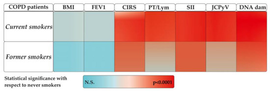 APA StyleRusso, P., Milani, F., De Iure, A., Proietti, S., Limongi, D., Prezioso, C., Checconi, P., Zagà, V., Novazzi, F., Maggi, F., Antonelli, G., & Bonassi, S. (2024). Effect of Cigarette Smoking on Clinical and Molecular Endpoints in COPD Patients. International Journal of Molecular Sciences, 25(11), 5834. https://doi.org/10.3390/ijms25115834