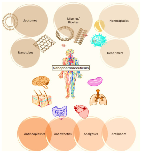 Many nano-drugs such as antineoplastics, anaesthetics, analgesics, and antibiotics are the most common in the following pharmaceutical forms of powder infusions, solutions, suspensions for injections as well as emulsions, and they all can be classified as nanopharmaceuticals (Figure 1). Nanomaterials are particularly useful in delivering drugs to the tumor tissues. Due to their characteristics, nanopharmaceuticals have many advantages over conventional chemotherapy preparations. The biggest advantage is the targeted delivery of the drug to the tumor tissue, which results in reduced systemic toxicity, the most prominent disadvantage of conventional chemotherapy. Thanks to the clinically achieved success, in recent years, among all the nanocarriers, liposomes and micelles have achieved the most attention and the greatest application. Based on the administration routes by which nanopharmaceuticals can be applied, we can distinguish intravenous, intranasal, intracerebral, intrathecal, intraventricular, intraperitoneal, transcranial, oral, and ocular applications of nanomaterial forms.