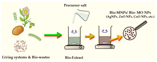MNPs and MONPs can be synthesized by physical and chemical methods, but by electrochemical or photochemical methods as well. Since the physical methods include expensive synthesis and little yield, and the chemical methods are unsafe due to the involvement of hazardous chemical substances that are attached to the surface of MNPs/MONPs, research has been shifted towards the synthesis of MNPs using biological methods that are economical, biocompatible, and non-toxic. This is called the biosynthesis or “green” synthesis. The biosynthesis of MNPs/MONPs has been reported in different microorganisms, including bacteria, actinomycetes, fungi, yeasts, and viruses as well [102]. The “green” synthesis of MNPs/MONPs is schematically displayed in Figure 3.