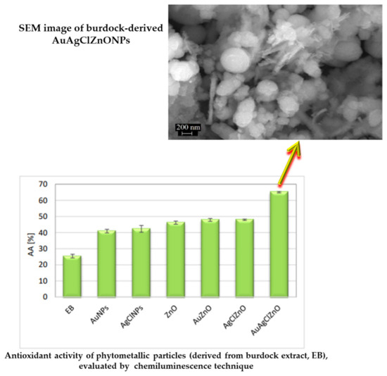 Burdock (Arctium lappa L.) aqueous extract was used to generate metal and semiconducting particles (AuNPs, AgClNPs, ZnO, AuZnO, AgClZnO, and AuAgClZnO) with efficient photocatalytic activity, as well as antioxidant and antimicrobial properties. The tricomponent system AuAgClZnO showed the best antioxidant activity for capturing ROS and ABTS•+ radicals, and the best antibacterial activity against Escherichia coli, Staphylococcus aureus, and Pseudomonas aeruginosa (see Figure 4). These “green” developed composites can be used as potential adjuvants in the biomedical field (antioxidant or biocidal agents) or in environmental protection (as antimicrobial agents and photocatalysts for the degradation of water pollutants) [107].