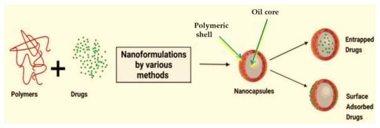 Nanomicelles are structures around 5–100 nm that are able to take both hydrophilic and hydrophobic agents. They are formed when amphiphilic molecules assemble themselves under a critical micellar concentration—CMC. The particles may be formed in aqueous or non-aqueous solutions where the nonpolar region forms the interior and the polar region forms the exterior phase of a micelle. Depending on the ionic strength, surfactant concentration, and pH of the solutions, micelles usually have a spherical form. Still, sometimes, they can have a cylinder and ellipsoid shape too [19]. A number of surfactants in a solution and the chain length of surfactant molecules influence the micelle formation. If a molecule’s chain length is longer, then micelles will form at lower concentrations. Also, if dissolved salts are present in the solution, a lower critical micelle concentration is needed. Alcohols influence the CMC, with the CMC value increasing from methanol to butanol. Temperature increases also increase the CMC [20]. Micelles are usually made through surfactant molecules that may be nonionic, ionic, and cationic detergents. Some nanomicelles may contain a mixture of lipids and detergents. The CMC and the typical number of detergent molecules depend on the micelles’ lipids concentrations. Polymeric micelles formed by the self-assembling of amphiphilic block copolymers in an aqueous environment function as a solubilizing agent for hydrophobic drugs. It is the best alternative to enhance the solubility and bioavailability of the drugs loaded [21].