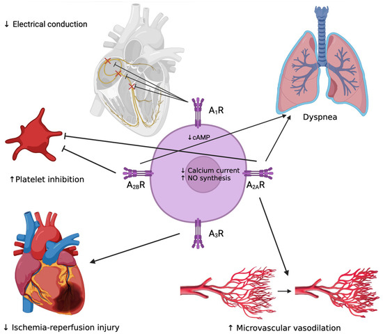 Dyspnea is the consequence of the activation of A1R and A2AR in the vagal C fibers on the bronchial wall [41], while bradyarrhythmia is mediated mainly by the activation of A1R.