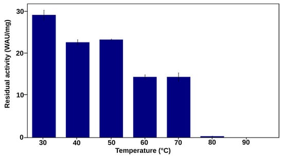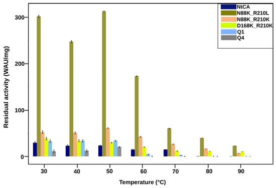 Most combination mutants were not successful in the improvement of activity and thermostability. The mutant Q4, with A159F, D168P, D197E and R210K, exhibited loss of activity as low as 60 °C (Figure 7). Similarly, the Q1 mutant had very little residual activity after incubation at 60 °C. After incubation at 30 °C, the most improvement in activity was observed for mutant N88K_R210L (Figure 6). It exhibited an improvement in activity compared to the mutant N88K but a lower activity and thermostability than that of the R210L mutant. This double mutant, however, showed the highest residual activity of all mutants in this study after incubation at 90 °C for an hour (22 WAU/mg). Although not much improvement in activity was observed for mutants N88K_R210K, D168K_R210K and Q3, these mutants had the highest activity after incubation at 90 °C at 12%, 25% and 20%, respectively, relative to their activities at 30 °C. Thermostability profiles for all combination mutants are shown in the Supplementary Materials (Figure S6).