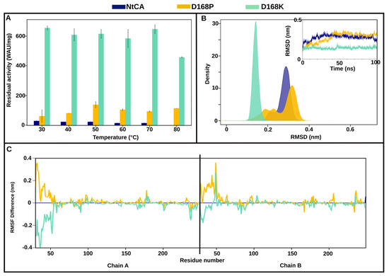 D168P/K. (A) Residual activity of NtCA (blue), D168P (orange) and D168K (light green) after incubation for 1 h at 30–80 °C. (B) Kernel density estimation graph of root mean square deviation (RMSD) of NtCA, D168P and D168K, with a corresponding RMSD line graph inside calculated over the 100 ns trajectories. (C) Root mean square fluctuation (RMSF) line graph of dimeric structures of NtCA, D168P and D168K.
