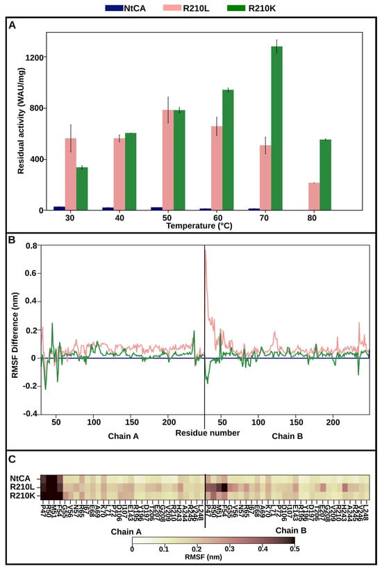 R210L/K. (A) Residual activity of NtCA (blue), R210L (pink) and R210K (green) after incubation for 1 h at 30–80 °C. (B) The line graph shows the difference of RMSF of residues in R210L (pink) and R210K (green) compared to NtCA (blue). (C) RMSF heatmap of the interface residues in the dimeric structures of NtCA, R210L and R210K.
