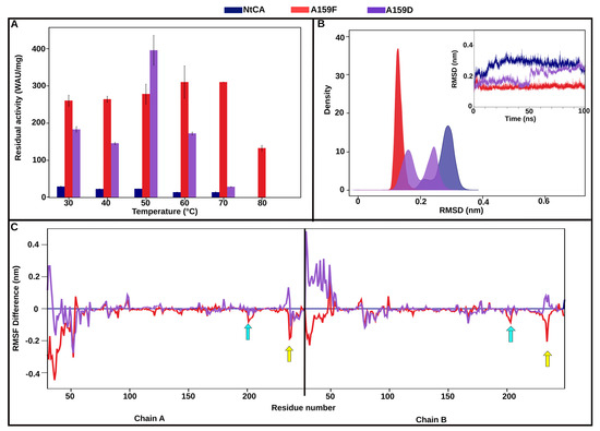 A159F/D. (A) Residual activity of NtCA (blue), A159F (red) and A159D (purple) after incubation for 1 h at 30–80 °C. (B) Kernel density estimation graph of RMSD, with a corresponding RMSD line graph inside. (C) The line graph shows the difference in RMSF of residues in A159F (red) and A159D (purple) compared to NtCA (blue). Yellow and blue arrows are indicative of loops showing a reduction in fluctuations upon mutation to A159F.