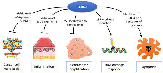 Multiple molecular functions of ECRG2. ECRG2 is a pleiotropic protein that plays important roles in diverse cellular phenotypes including cancer cell metastasis, inflammation, centrosome duplication, DNA damage response, and cell death by apoptosis.