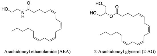 Endocannabinoids are endogenous lipidic neurotransmitters that interact, among other things, with the CBs. They are synthesized in the post-synaptic terminals on demand in response to neuronal activation in a Ca2+-dependent manner and can subsequently bind to presynaptic CBs []. The two variants of arachidonic acid (AA), the 2-arachidonoyl glycerol (2-AG) and the arachidonoyl ethanolamide (AEA), also known as anandamide, are the most known and studied. However, even if their chemical structures are very similar, as shown in Figure 1, different enzymatic pathways carry out their synthesis and degradation to ensure a different physiological and pathophysiological role for these two molecules []. For instance, AEA has a high agonist affinity for CB1 and is almost inactive for CB2; meanwhile, 2-AG is a full agonist with moderate to low affinity for both CBs. However, both compounds interact with a large variety of receptors besides CBs, which will be further discussed in Section 2.3 [].