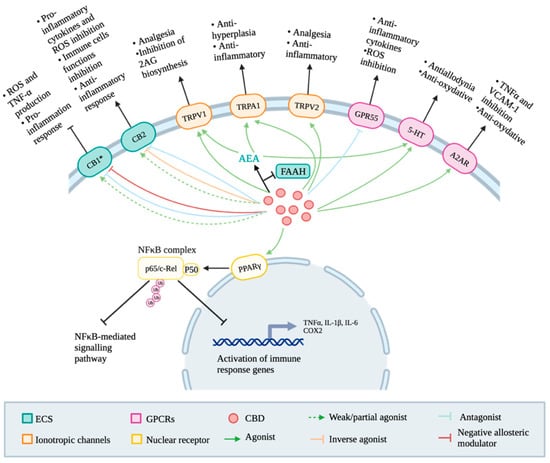 Although the discovery of CBD predates that of THC, this compound has been less extensively studied due to its lack of psychotropic effects. However, the recent regain of interest in CBD as a pharmacological compound has prompted professionals and researchers to look deeper into the molecular pathways underlying its various therapeutic effects. Consequently, the data regarding its mechanisms of action as a therapeutic agent are now overflowing and sometimes incongruous []. Therefore, this section provides a comprehensive review of the main pathways underlying the therapeutical potential of CBD as an anti-inflammatory and analgesic agent. Additionally, a schematic representation (Figure 3) summarizing CBD’s targets is included at the beginning of this section to enhance comprehension.